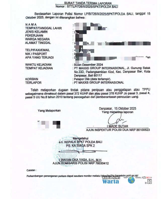 In response to this issue, LBH FKPPI Bali has reported alleged criminal acts involving PT Maxxs Group to the Bali Regional Police. The official report is registered under number LB/B/726/X/2025/SPKT/POLDA BALI, dated October 15, 2025.